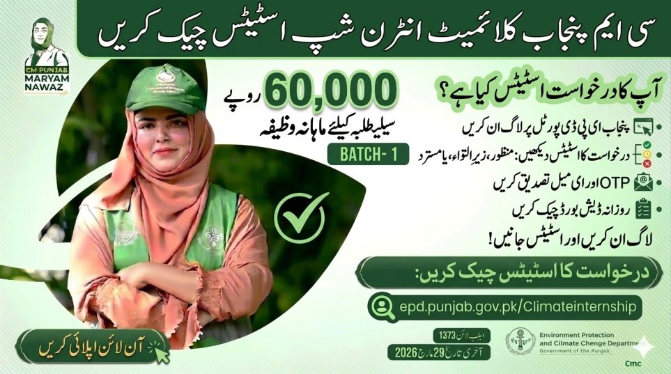 Checking your application status for the CM Punjab Climate Leadership Development Internship Program 2026 is very important after submitting your form. This internship offers a Rs 60,000 monthly stipend, valuable work experience, and a verified government certificate. Make sure you meet the 18–25 age requirement, hold a valid Punjab domicile, and keep your registered email active. If you face any technical issue, you can call the helpline 1373 for assistance. Always check your dashboard on https://epd.punjab.gov.pk to stay updated before the final deadline of 29 March 2026.